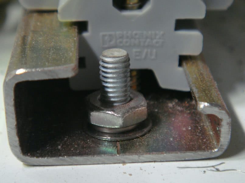 Для этого после монтажа, нужно подтянуть центральный болтик. Тем самым снизу механизм крепежа распирается и зацепляется своими металлическими частями за ободки рейки. Это обеспечивает достаточно надежный контакт.