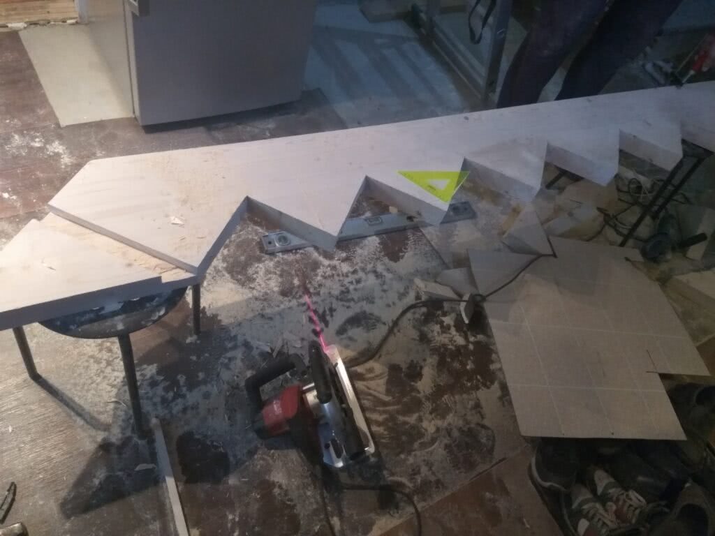 В процессе пришлось делать поправки на месте, так как пол и стены оказались неровные. Все подогнали, собрали, потом разобрали обратно, покрыли двумя слоями антисептика и паркетного лака, подсушили и снова все собрали, основательно закрепив.