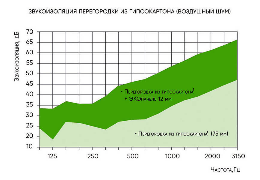 На рисунке приведена частотная характеристика звукоизоляции каркасной перегородки. Светло-зеленым показана характеристика перегородки из профиля ПС 50/50 с заполнением каркаса акустической минеральной ватой и обшивкой листами гипсокартона толщиной 12,5 мм. в один слой с каждой стороны. Темно-зеленый цвет показывает увеличение звукоизоляции перегородки, если перегородку обшить с одной стороны листами в два слоя. Причем, в качестве нижнего слоя использовать звукоизоляционные панели из гофрокартона толщиной 12 мм.