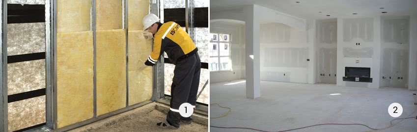 - Звукоизоляция стены из гипсокартона в квартире начинается с того, что ее каркас монтируют на виброленту. Она укладывается в два слоя, крепится к стенам, полу и между собой виброгерметиком;