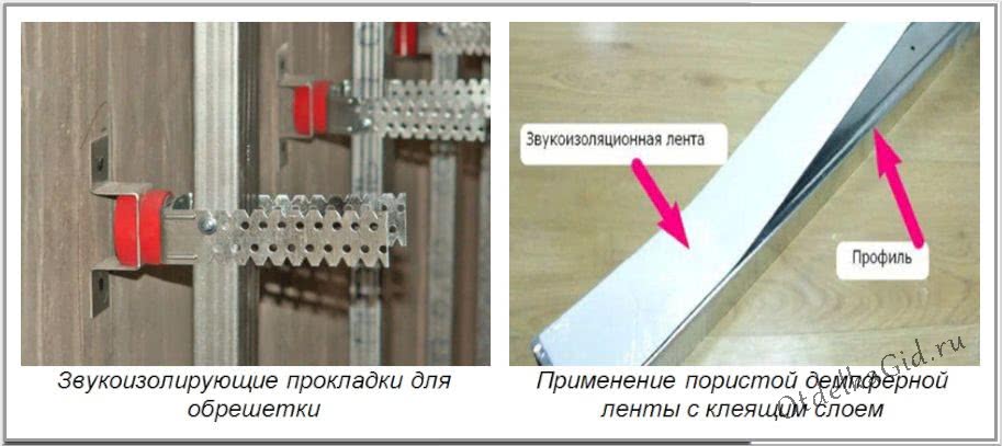 Помимо пластиковых дюбелей, обрешетку под шумоизолирующий гипсокартон желательно монтировать на звукоизоляторах, к тому же все контактные плоскости профилей обязательно проклеиваются пористой демпферной лентой
