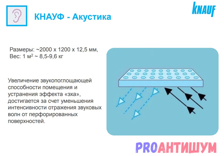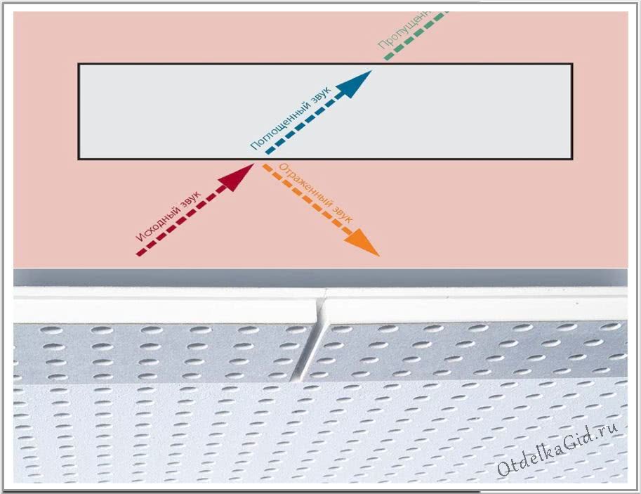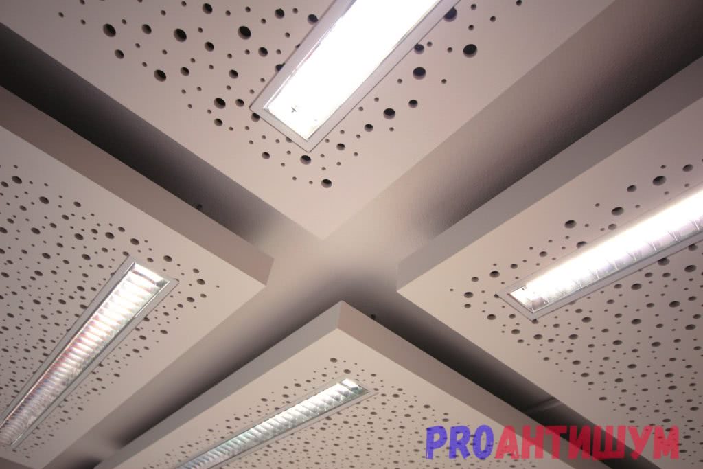 Несмотря на то что гипс — материал плотный и должен хорошо передавать звуковые колебания, за счет перфорации гипсовые плиты способны снижать уровень шума до 70 %