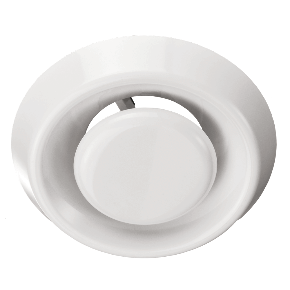 Пластиковое устройство, которое отличается простым монтажом и высоким сроком службы. Для большего удобства изделие оснащается установочным фланцем и стопорным кольцом. Такое решение способствует быстрой и качественной установки в круглые воздуховоды. Центральная часть свободно вращается, благодаря чему регулировка становится плавной.