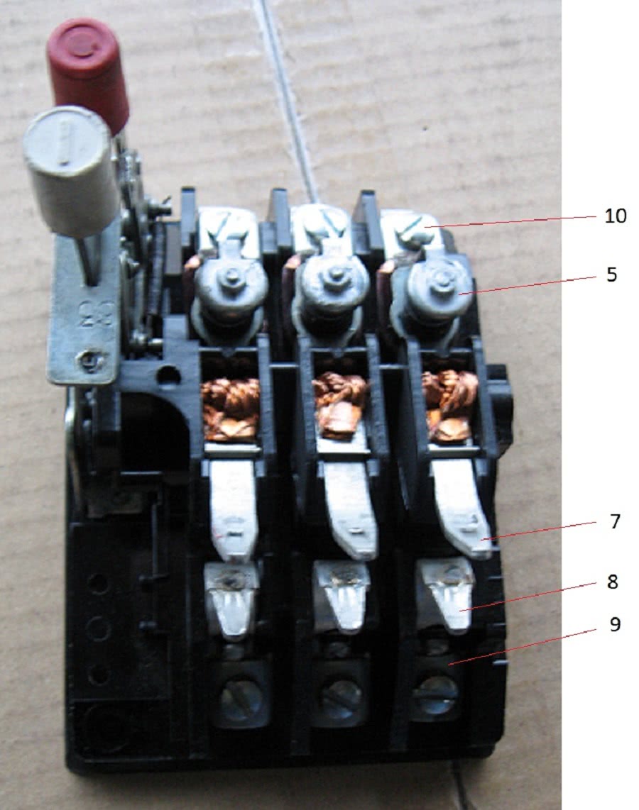 Тепловой и электромагнитный расцепители (5 и 6) подключаются в сеть последовательно между подвижным контактом 7 и контактным выводом 10. Для обеспечения высокой стойкости к износу подвижный контакт подключается с помощью медного многопроволочного плетёного проводника.