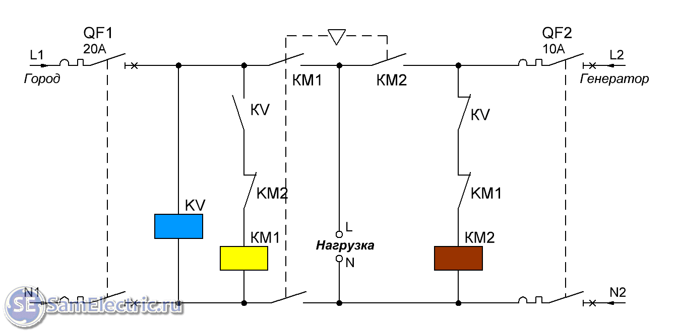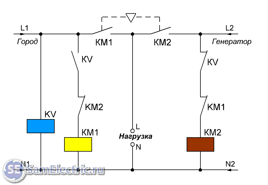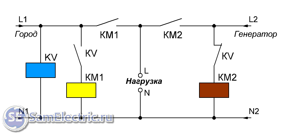 Когда напряжение из города поступать перестаёт, KV выключается, и своим НЗ контактом включает контактор КМ2, и фаза L2 поступает на нагрузку.