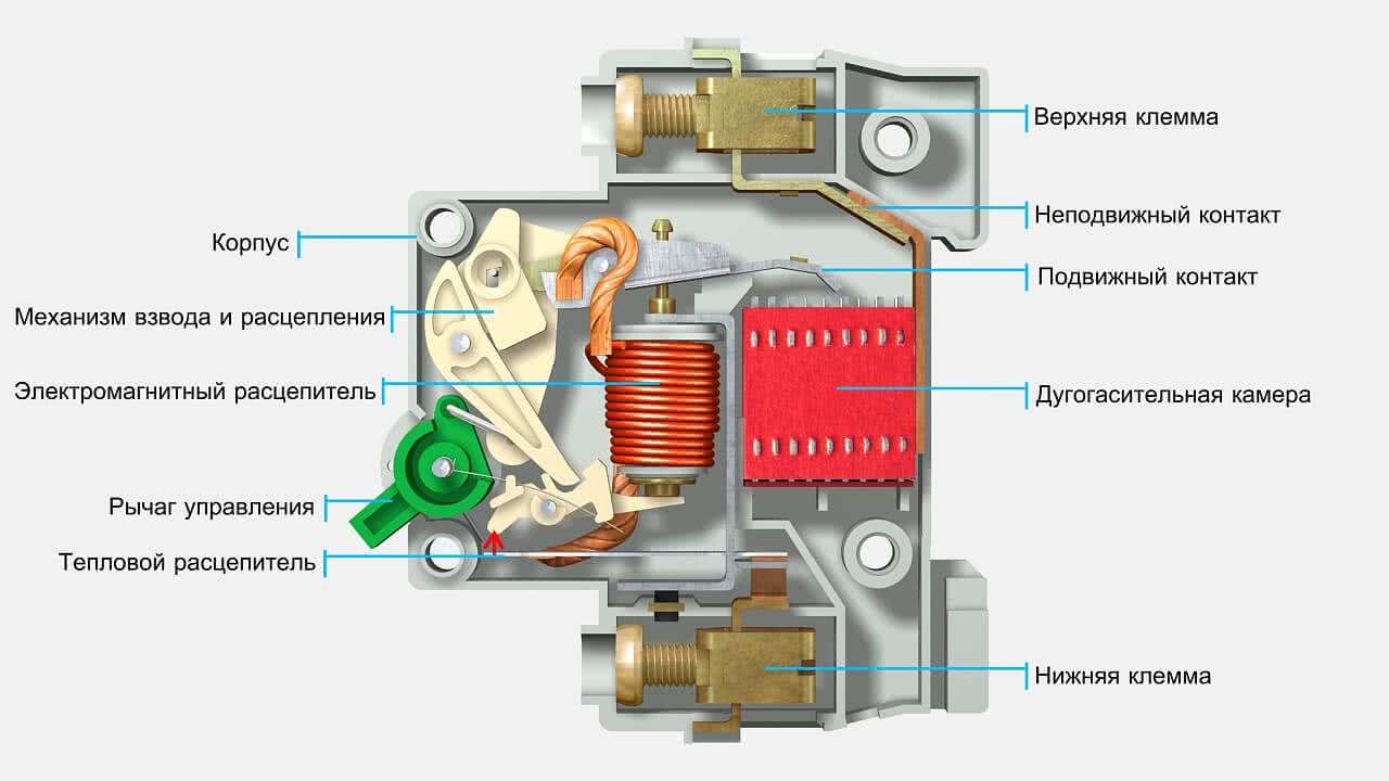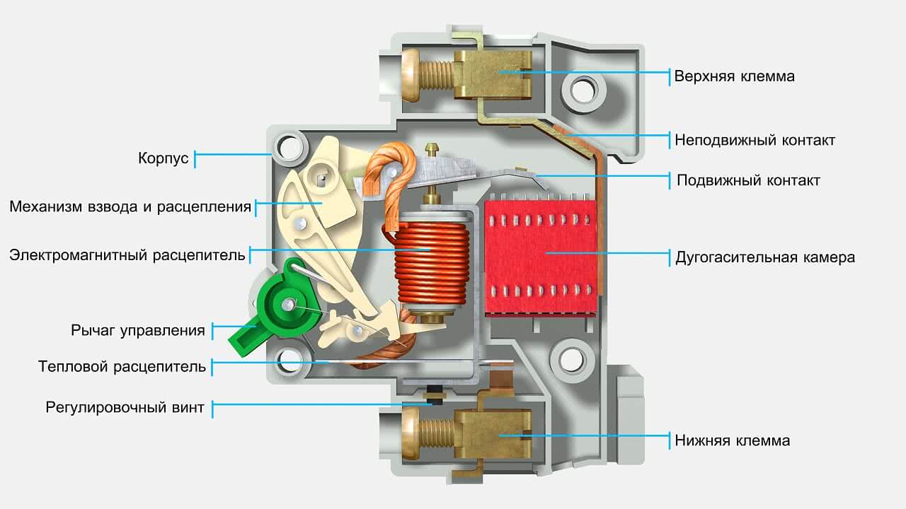 • силовые контакты (подвижный и неподвижный), обеспечивающие коммутацию; • механизм взвода и расцепления, который взаимосвязан с рычагом управления; • катушка (электромагнит) и подвижный сердечник (якорь), выполняющий функцию толкателя. Эти элементы являются электромагнитным расцепителем и обеспечивают защиту от токов к.з.; • дугогасительная камера. Данное устройство выполняет быстрое гашение дугового разряда, который образуется при размыкании контактов; • биметаллическая пластина. Данный элемент является тепловым расцепителем и обеспечивает защиту от повышенной нагрузки. Также имеется регулировочный винт, при помощи которого обеспечивается регулировка значения тока, при котором данный расцепитель должен сработать.