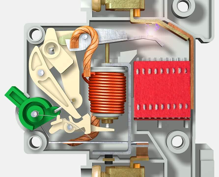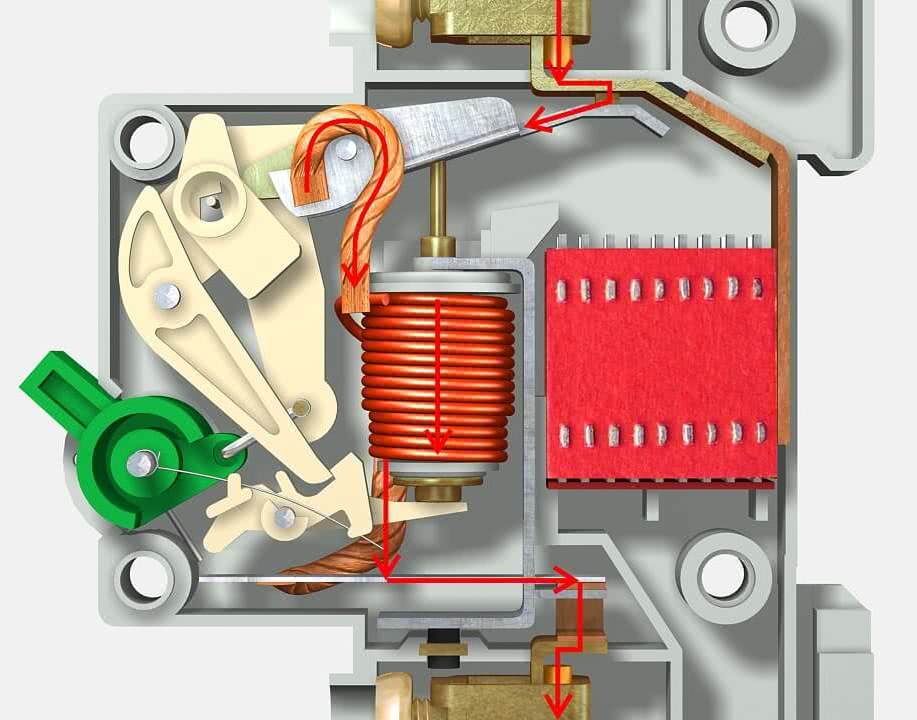 Электромагнитный расцепитель предназначен для защиты сети от короткого замыкания и по принципу работы отличается от теплового. Под действием сверхтоков КЗ в соленоиде возникает мощное магнитное поле. Оно сдвигает в сторону сердечник катушки, который размыкает силовые контакты защитного устройства, воздействуя на механизм расцепителя. Питание линии прекращается, благодаря чему исчезает опасность возгорания проводки, а также разрушения замкнувшей установки и автоматического выключателя.