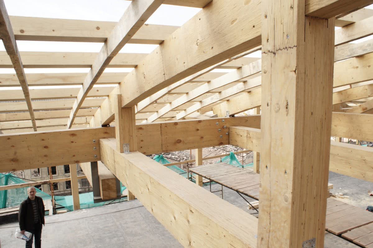 Это все не может быть удержано строительными конструкциями, если не будет балок перекрытия. Они играют роль своеобразного особо прочного скелета, связывающего разные по высоте ярусы. Вплоть до конца XIX века единственным вариантом организации такого скелета были деревянные и металлические конструкции.