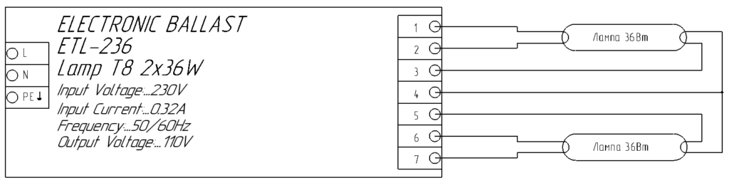 Схема подключения ЭПРА 2х36 Вт (Пример:ELECTRONIC BALLAST ETL-236)