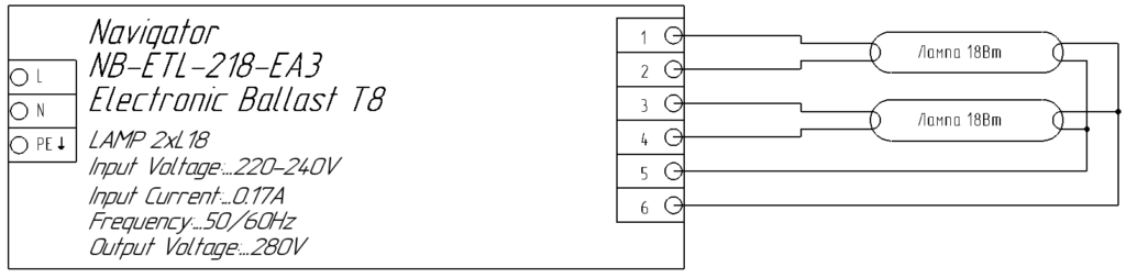 Схема подключения ЭПРА 2х18 Вт (Пример:Navigator NB-ETL-218-EA3)