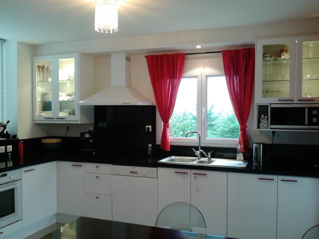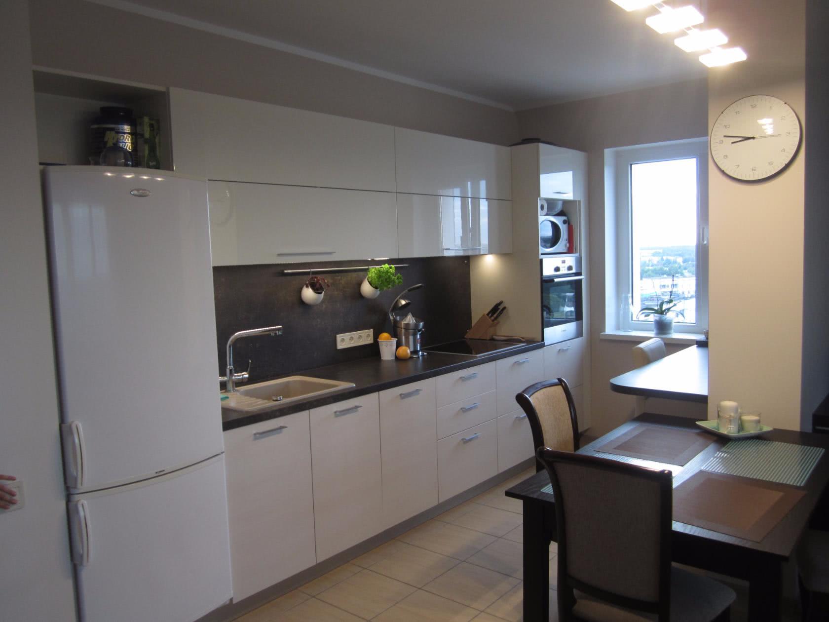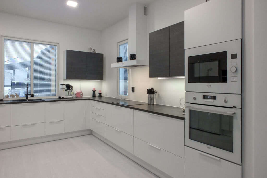 - Сочетание светлой мебели с темной бытовой техникой уместно, но тогда и другие детали должны подчеркивать эту комбинацию. Это не только шторы или отделка обеденной зоны, но и утварь, декор, возможно, даже часть фасадов в нижней части гарнитура.