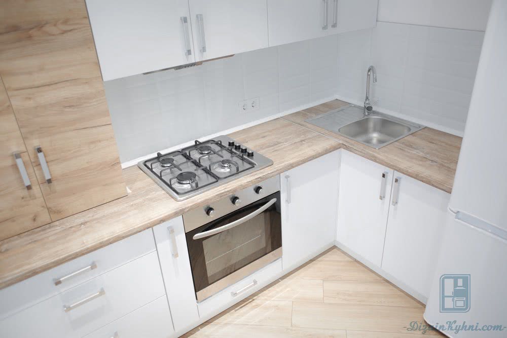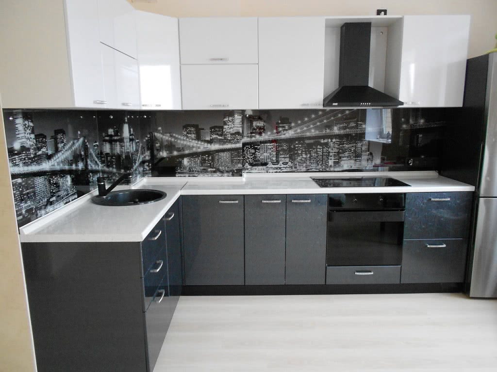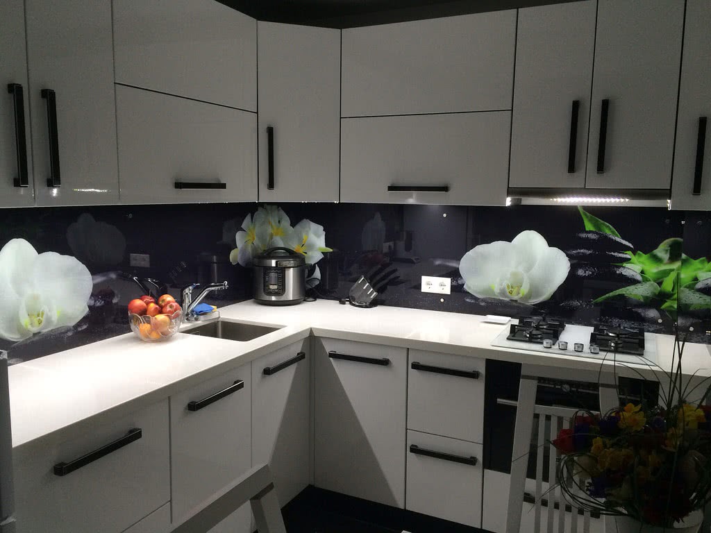 - Угловые кухни в белом цвете не позволяют раскрыть фартук как яркую деталь, поэтому в таком случае подойдет традиционная плитка или неброский рисунок.