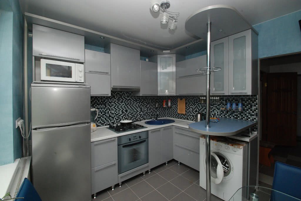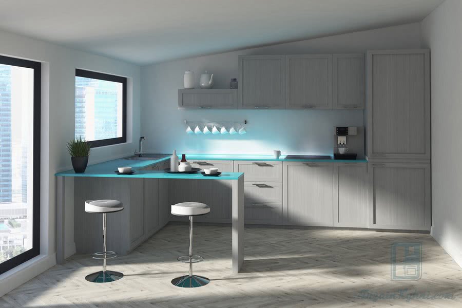 Модификации данного типа удачно вписываются в интерьер кухонь разной площади. Установка мебели может быть параллельной с рядом напольных шкафов, установленных вдоль противоположной стены напротив основного (линейного) гарнитура. При выборе модели данного типа необходимо подбирать тона синего цвета с примесью серого, чтобы исключить заливание пространства резким цветом. Если нужна кухня с барной стойкой, стоит купить мебель углового типа и изогнутыми линиями.