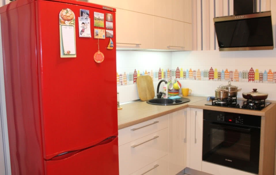На кухне, интерьер которой выполнен в современных стилях, можно установить бытовую технику разных цветов — например, красный холодильник.