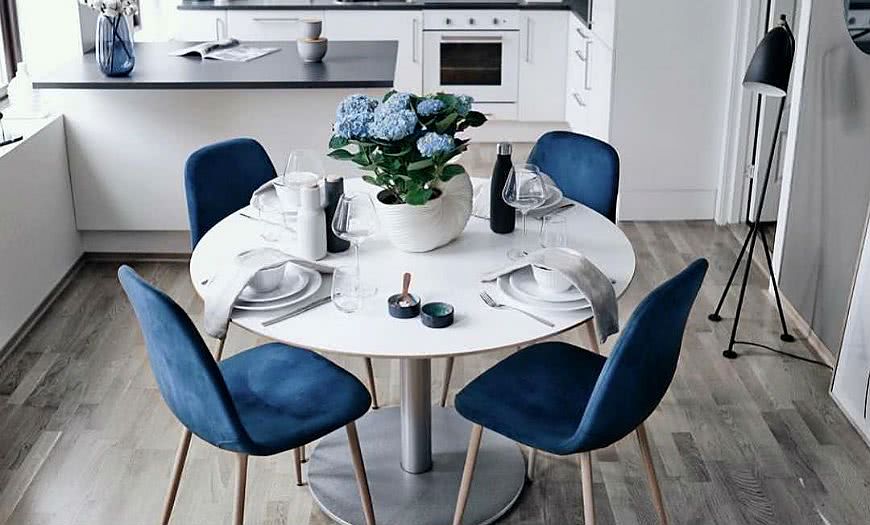 Чтобы помещение не напоминало стерильную операционную или лабораторию, к нему необходимо добавить несколько ярких цветовых оттенков. Например, украсить окна голубыми занавесками, обустроить фартук в голубых тонах, установить голубые стулья и обеденный стол.