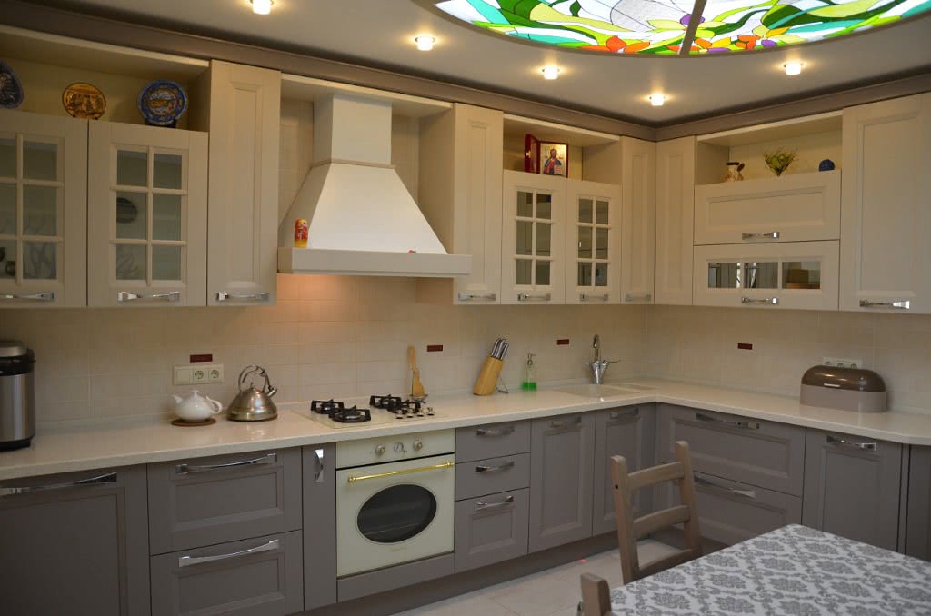 - Классика. Светлый гарнитур, состоящий из навесных шкафов с распашными дверками, серванта и пенала в комбинации с натуральным деревом создаст атмосферу домашнего тепла, уюта и респектабельности хозяев.