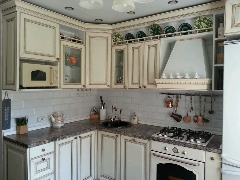 Кантри. Этот стиль совмещает в себе комфорт и простоту. В него впишутся открытые полки, расписная глиняная посуда, а также обилие декоративных деревенских предметов.