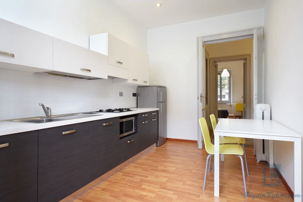 Светлый пол привлекает внимание сам по себе, поэтому важно выбрать наиболее гармоничный вариант. Это может быть долговечная и влагоустойчивая плитка, палубная доска, линолеум или же износоустойчивый ламинат. Тогда даже темный верх гарнитура будет казаться оригинальным, но достаточно легким решением для светлого пространства
