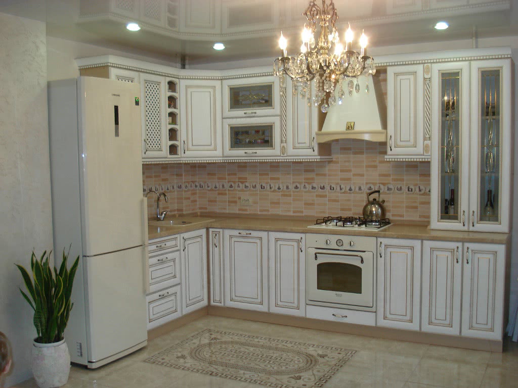 К классическим интерьерам стоит добавить немного позолоты, хрусталя и цветного стекла. Оживить интерьер поможет яркая посуда и кухонная утварь.