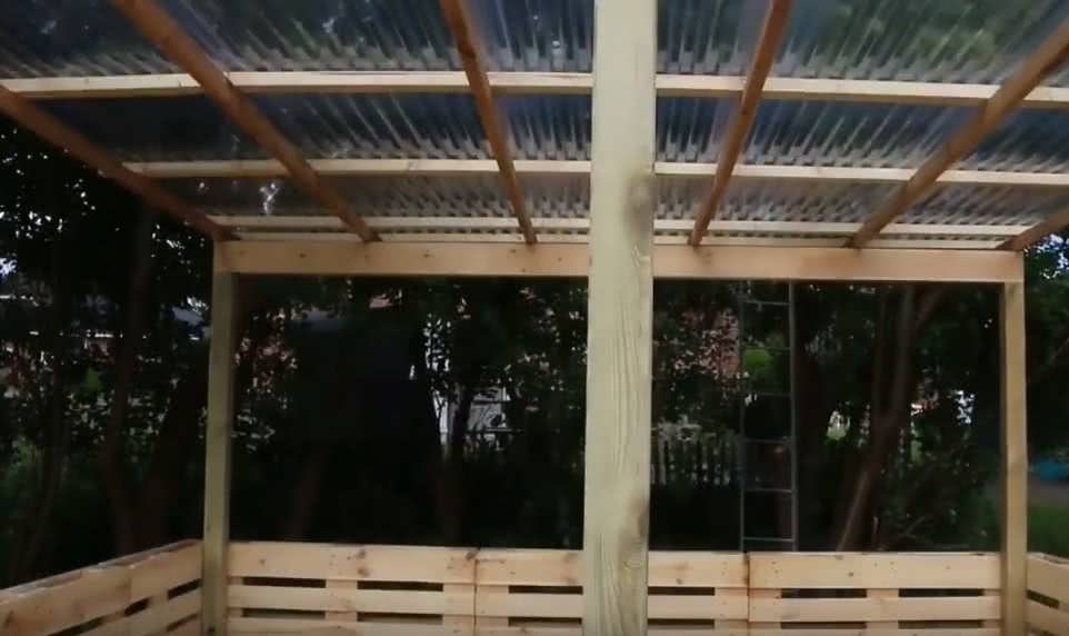 Выбирая крышу из паллет, следует учесть, что сверху их необходимо накрыть водонепроницаемым материалом (пленка, рубероид). Даже сложенная в два слоя конструкция не спасет посетителей от промокания во время дождя.