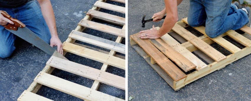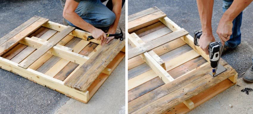 Стол из паллеты, шаги 2 и 3: заполнение досками верхней поверхности будущего изделия