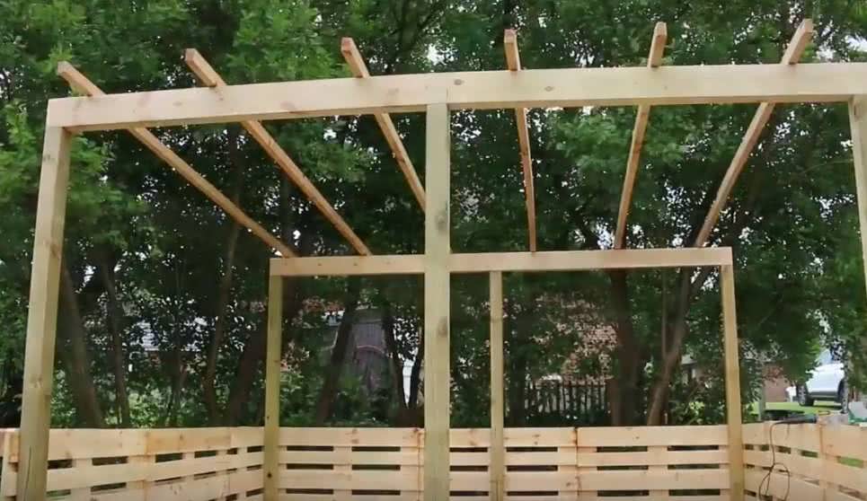 Строительство навеса на сваях всегда начинается с их соединения между собой. Лучше всего для этих целей использовать деревянные балки 100 на 100, хотя металлический профиль тоже подойдет. На выполненный таким образом каркас монтируются поддоны. Поскольку паллеты для пола будут подвергаться воздействию влаги сильнее всего, заранее позаботьтесь о дополнительной обработке.