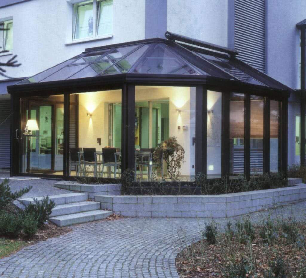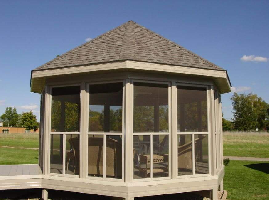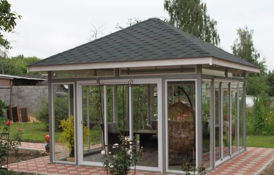 Что касается профилей для остекления беседки, то лучше всего использовать алюминиевую конструкцию. Поверх профиля можно сделать напыление под сталь, бронзу, золото или серебро, благодаря чему беседка обретет благородный и роскошный внешний вид. Помимо стекла и металла здесь можно использовать деревянные дверные блоки, создающие герметичность и хорошую вентиляцию конструкции. По типу открытия застекленные беседки делят на три группы: откидные, поворотные и раздвижные. Последний вариант самый дорогой, но благодаря такому остеклению беседку можно трансформировать из открытой в закрытую в зависимости от погоды.