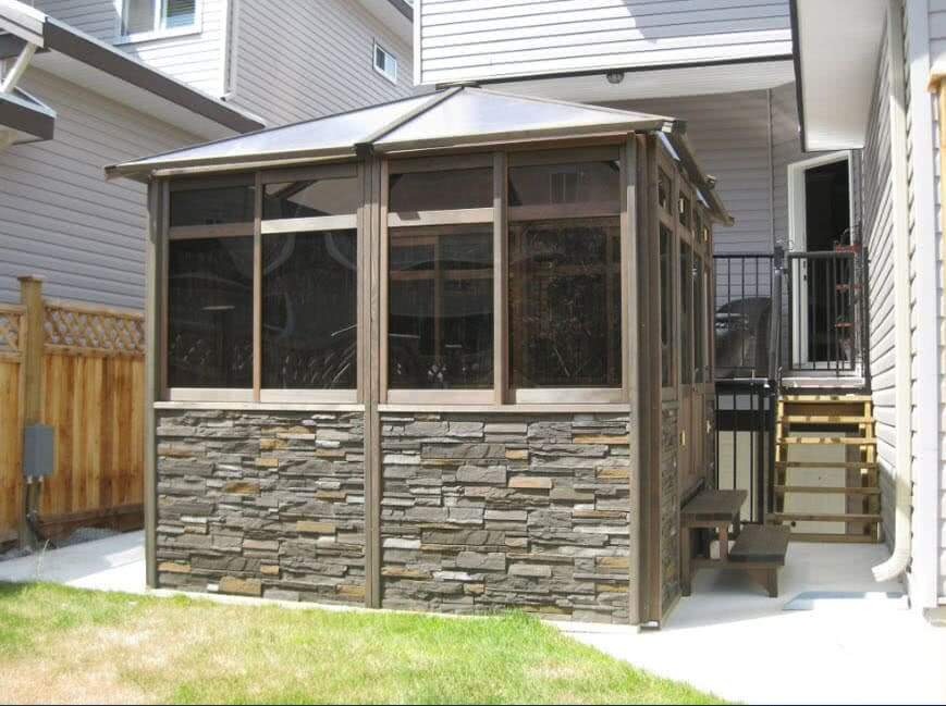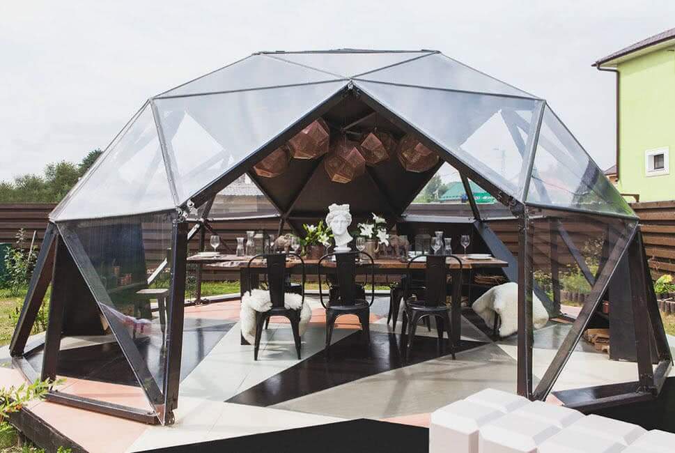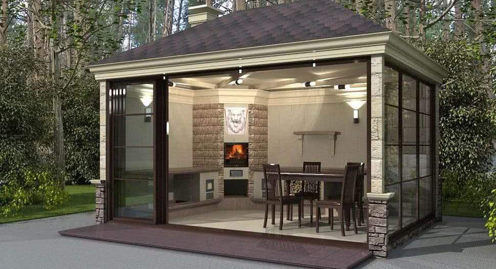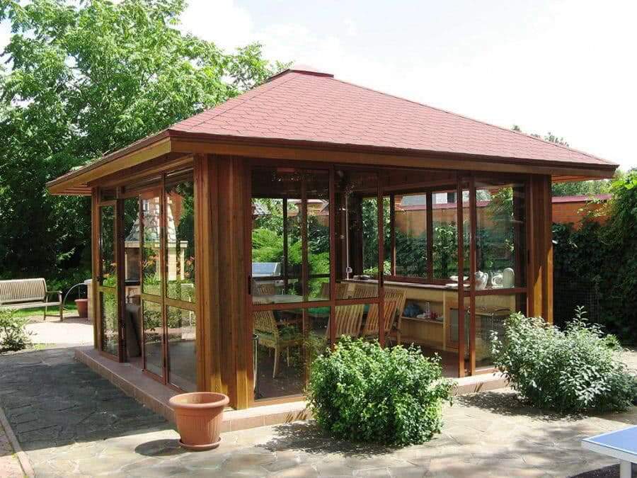 Застекленные беседки с барбекю станут хорошим решением для северных регионов. Стандартная кухня может быть заменена такой постройкой.