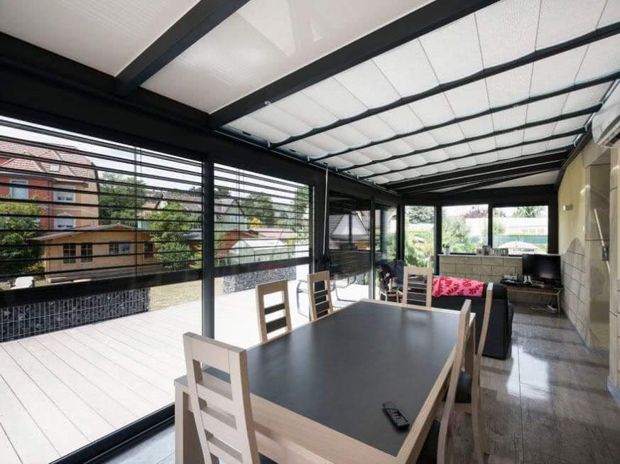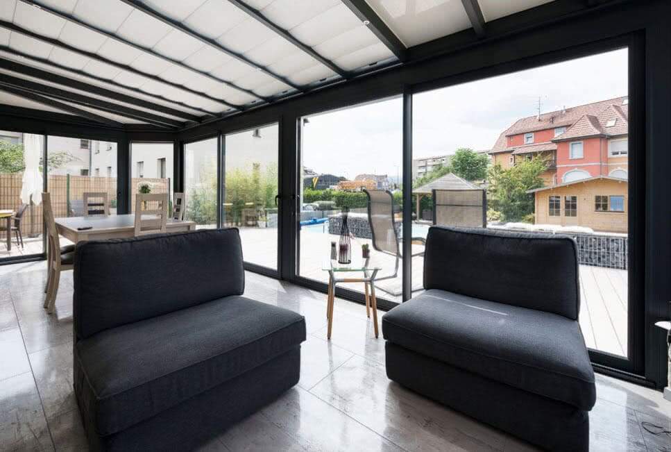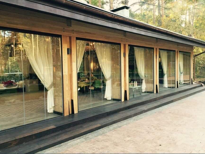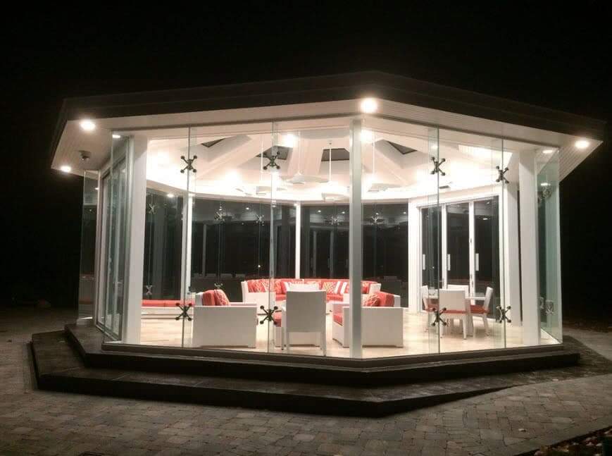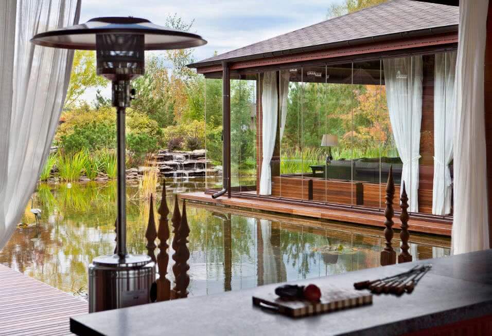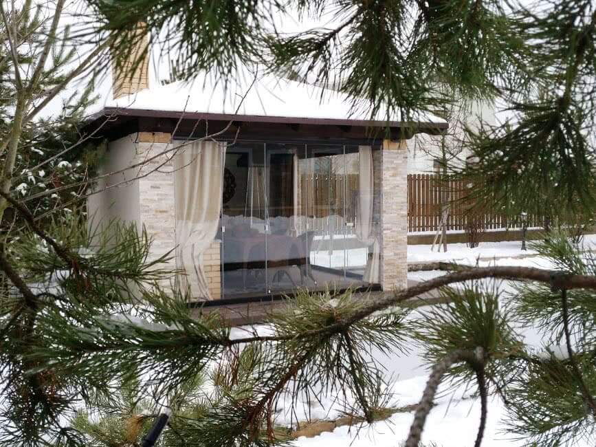 - Великолепно выглядят застекленные беседки с большими панорамными окнами. Пользуются спросом беседки с раздвижными стеклянными секциями.