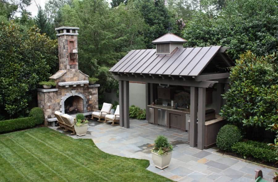 Расположение мангала снаружи позволяет сэкономить на мерах безопасности и решает проблему с высокой температурой. Особенно наружный мангал рекомендуем для деревянных беседок. Но и тут есть свои подводные камни. Во-первых, снаружи мангал занимает дополнительное место, а во-вторых, придется сооружать навес, который защитит повара и очаг от дождя. Какой вариант выбрать, решать вам, учитывая все факторы.
