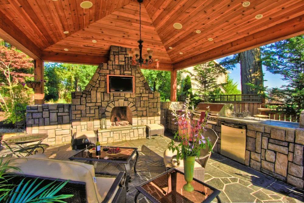Обустраивая зону отдыха или летнюю кухню, рекомендуется применять кирпич, плитку, а деревянные конструкции пропитать специальным противопожарным раствором.
