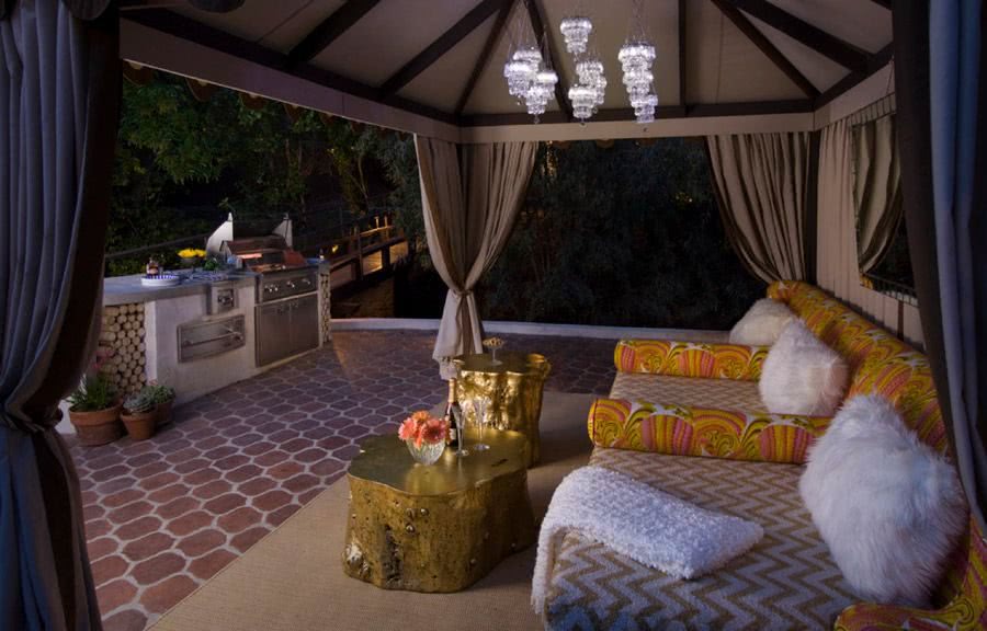 Однако изготовить такие декоративные детали под силу не каждому. Намного проще собрать каркас из металлического профиля и обшить изнутри и снаружи отделочным материалом. Если в стене проложить слой утеплителя, то такая беседка подойдет для использования в любое время года. Застекленная стена или участок крыши, а также большие окна визуально облегчат конструкцию и наполнят внутреннее пространство светом. А установка камина или печи позволит готовить и греться одновременно.