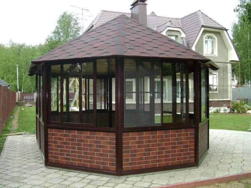 Основная конструкция застекленных беседок с мангалом, барбекю и печкой делается из следующих материалов.
