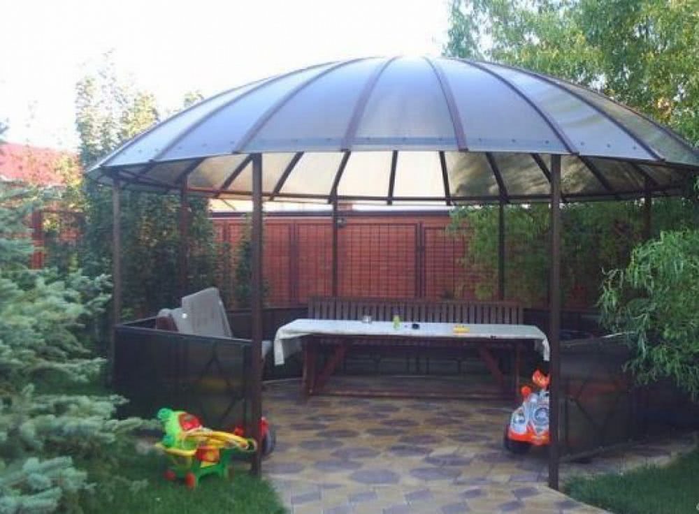 - навесы – беседки такого рода удобны тем, что не требуют особых усилий для их сооружения, не приходится беспокоиться за нагрев металла, к тому же, к столу имеется свободный доступ и облегчается уборка территории;