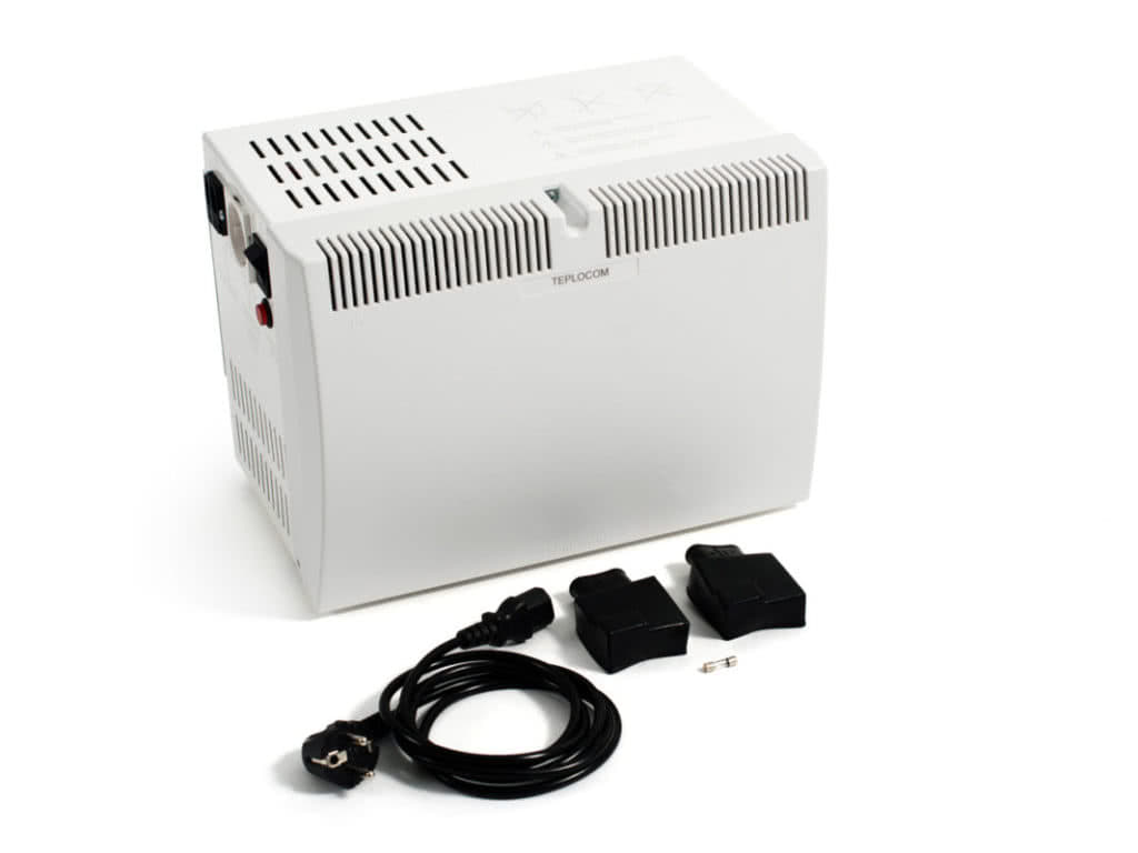 Изделие от компании «Бастион» включает две батареи. Время работы зависит от емкости, может быть продолжительностью до нескольких суток. В этом случае каждая АКБ по 12 В. Емкость составляет 40–200 Ач. Мощность в зависимости от модели 450–600 Вт. «Теплоком» обеспечивает стабильной синусоидой, его корпус располагается на стене в четырех положениях. На панели расположены индикаторы режимов.