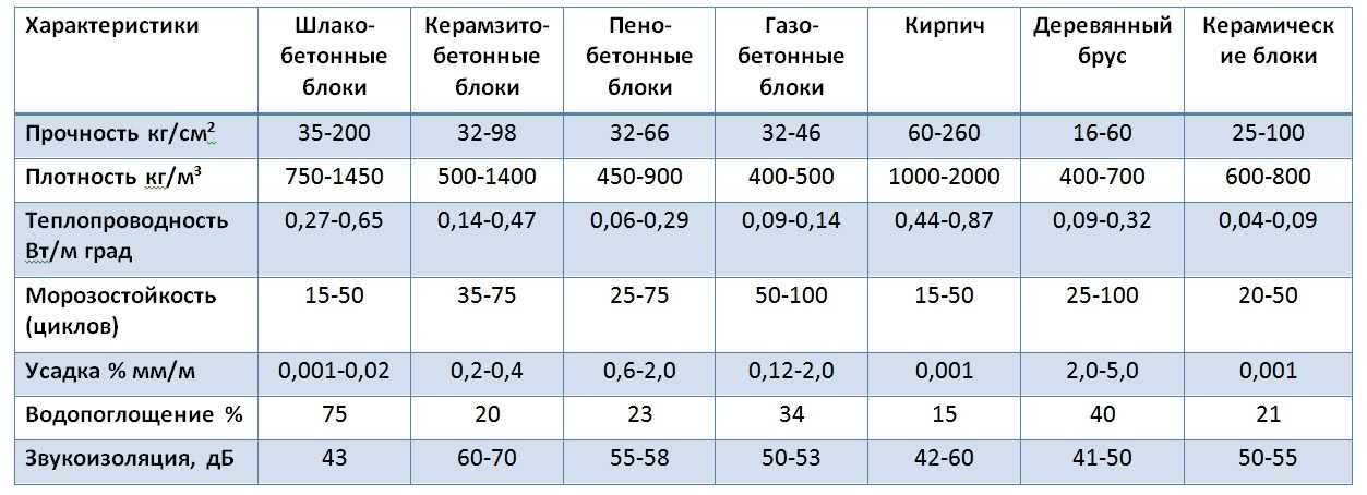 В таблице, представленной ниже, собраны технические показатели разновидностей блоков, описанных в предыдущем разделе, которая поможет определиться с выбором наиболее подходящих изделий для постройки конкретного здания, а также понять, чем отличаются пеноблоков от бетонных, газосиликатных, газоблоков и других видов.