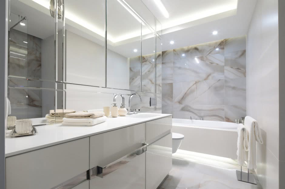 Это поможет, подобно использованию зеркал, визуально увеличить пространство. В большой ванной комнате керамическая плитка может быть выбрана в зависимости от ваших предпочтений.