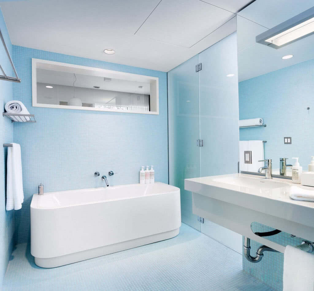 Мебель и внутренняя отделка ванной комнаты синего цвета