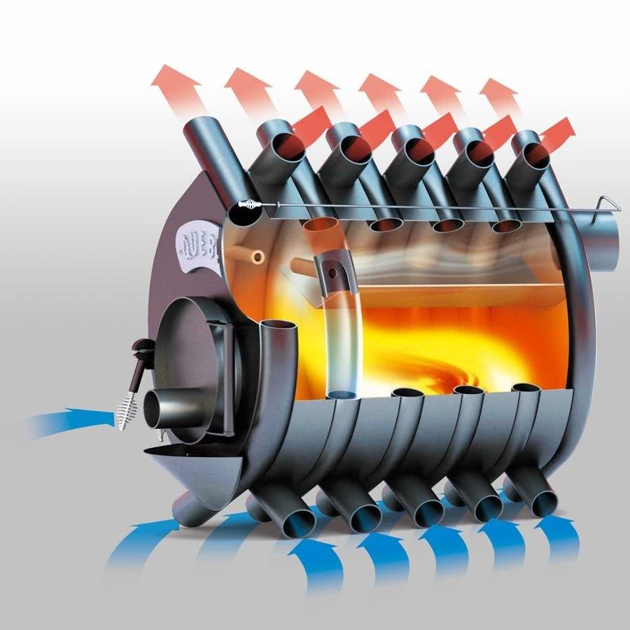 Если обычная печь типа буржуйки греет за счет теплового излучения от своего корпуса, то Булерьян без водяного контура греет за счет конвекции. Здесь используются трубы достаточно большого диаметра, полностью охватывающие камеру сгорания. Проходящий через них воздух нагревается до температуры +100-120 градусов и попадает в комнаты. Такая схема обеспечивает очень быстрый прогрев помещений.