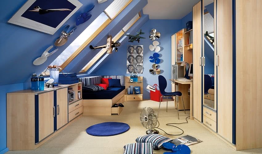 В соответствии от размеров и конфигурации подбирается мебель. В большинстве случаев её приходится делать на заказ. Если помещение маленькое, то не стоит его перегружать мебелью и другими элементами декора. В этом случае достаточно установить раздвижную кровать с местами для хранения вещей, рабочий стол и кресло. Но и большую детскую не стоит захламлять, лучше по максимуму оставить свободное место под игры.
