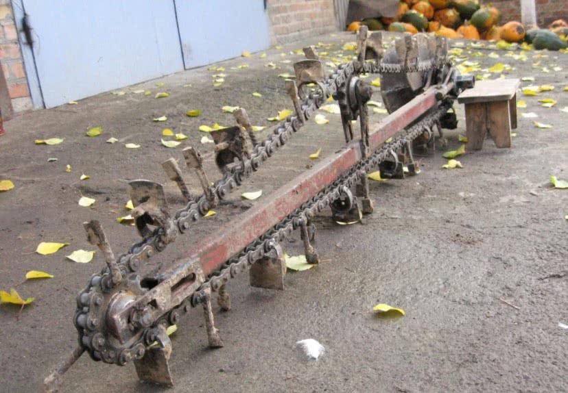 В основе конструкции – самодельная бара для мотоблока. Лишнего ничего нет. Каждая деталь механизма выполняет свою роль для облегчения труда оператора. В этих целях используются дорожные фрезы, самодельные зубья, цепь заводская, лопата отвальная или шнек, кожухи защитные.
