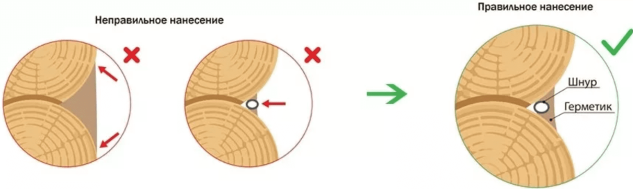 • Недостаточное или избыточное нанесение. В первом случае герметик просто не выполняет свои функции, во втором – у мастера возникают сложности с разглаживанием шва. При отказе в целях экономии от специальных лент излишки впитываются древесиной, что в свою очередь приводит к образованию пятен и ухудшении ее изоляционных свойств.