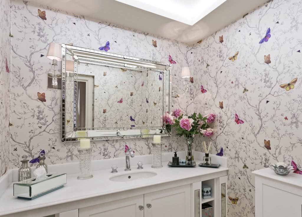 Хорошей альтернативой плиткам являются обои. Они отлично маскируют неровные стены, просты в нанесении и относительно недороги. Для ванных комнат используются виниловые или стекловолоконные обои, покрытые акриловым лаком или эпоксидной краской. Поскольку в ванной комнате высокая влажность для приклеивания обоев, вам следует выбирать только водостойкий клей. Обои идеально вписываются и сочетаются с керамической плиткой. Виниловая версия имеет слоистую структуру: внутри бумага, а снаружи винил. Такое покрытие устойчиво к свету, благодаря чему обои сохраняют цвет и водостойкость.