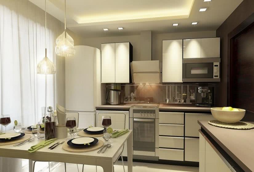 - Теплый свет лампы, расположенной посередине, подойдет для кухонь небольшого размера, которые не сложно осветить и одной люстрой. Лучше подбирать варианты с равномерно рассеивающими плафонами из матового стекла или пластика.