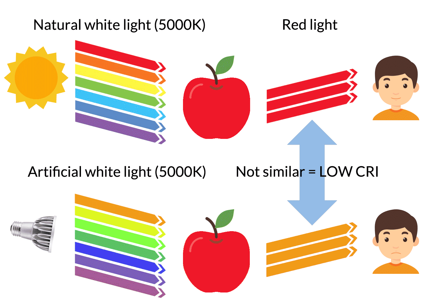 Свет – это довольно сложное и ёмкое понятие. Его основной характеристикой в плане разделения цветов является спектральный состав. Грубо говоря, для того чтобы жёлтый предмет выглядел жёлтым, необходимо чтобы он отражал только волны этой частоты, поглощая остальные. При работе со стандартами Ra значение имеет качество освещения предмета. Причина – в одном из свойств человеческого глаза: чем выше качество освещения, тем более тонкие оттенки различает глаз.
