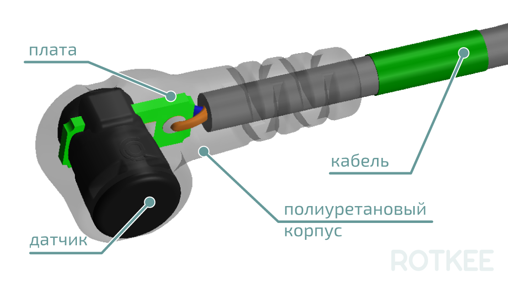 Корпус датчика изготовлен из полиуретана и надежно защищает чувствительный элемент датчика от возможных механических повреждений.