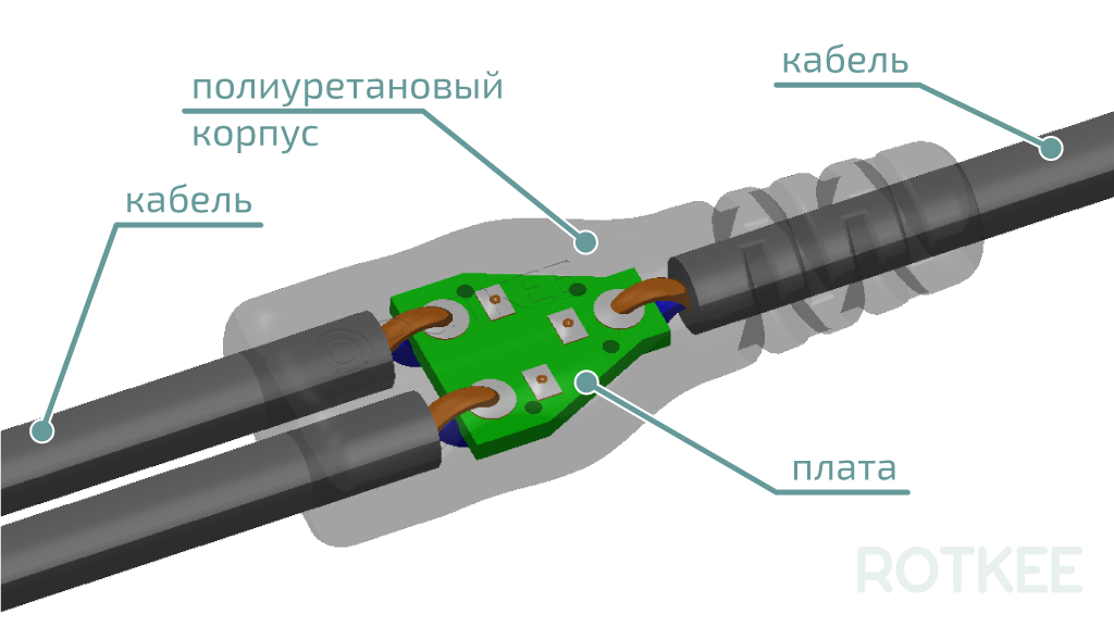 Данные монолитные соединения предотвращают обрыв кабеля при случайном рывке, а также значительно продлевает срок его службы.