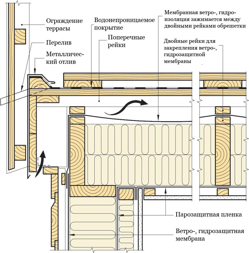 С открытых сторон вентилируемой террасы должны быть предусмотрены вентиляционные отверстия шириной не менее 30-40 мм. См. рис. 813a, b и c. Прохождение достаточного количества воздуха необходимо для отвода избыточной влаги. Чтобы обеспечить необходимый свес плоской кровли, на обвязочные балки террасы набивают в вертикальном направлении бруски. Толщина брусков должна быть в 5 раз больше вентиляционного зазора. Стойки ограждения террасы должны надежно крепиться к балкам террасы сквозь прибитые ранее бруски. См. рис. 813a. Если закрепить поручень ограждение террасы к стене основного дома невозможно или его длина ограждения составляет от 8 до 10 м, то перед тем как выбрать сечение стоек и тип деталей для крепления, необходимо провести детальный расчет, учитывающий актуальные моменты и нагрузки. Чтобы вода не стекала с открытых сторон террасы можно использовать в качестве бортиков рейку. В таком случае водонепроницаемое покрытие заводится поверх рейки. В качестве защиты от механически повреждений поверх рейки устанавливается металлический отлив. См. рис. 813b и c. На рис. 813c изображена та же конструкция вентилируемой террасы, что и на рис. 813b, только разрез сделан в поперечном направлении по отношению к балкам террасы. К тому же на рис. 813c показано устройство перелива применяющегося в качестве аварийного водоотвода с плоской кровли. Более подробно это было описано в пункте «Система водоотвода». Места стыков мембранной ветро-, гидрозащиты должны быть приподняты (См. рис. 813c). Для этого вначале поверх балок террасы набивают рейки, на них укладывают ветро-, гидрозащитную мембрану с небольшим провисанием между балками (см. также рис. 21.), а затем зажимают мембрану с помощью еще одного слоя реек.