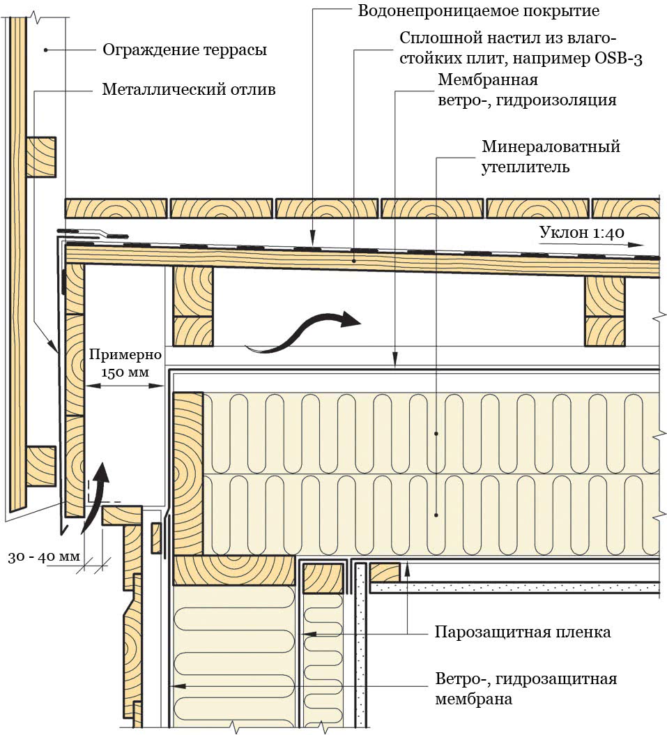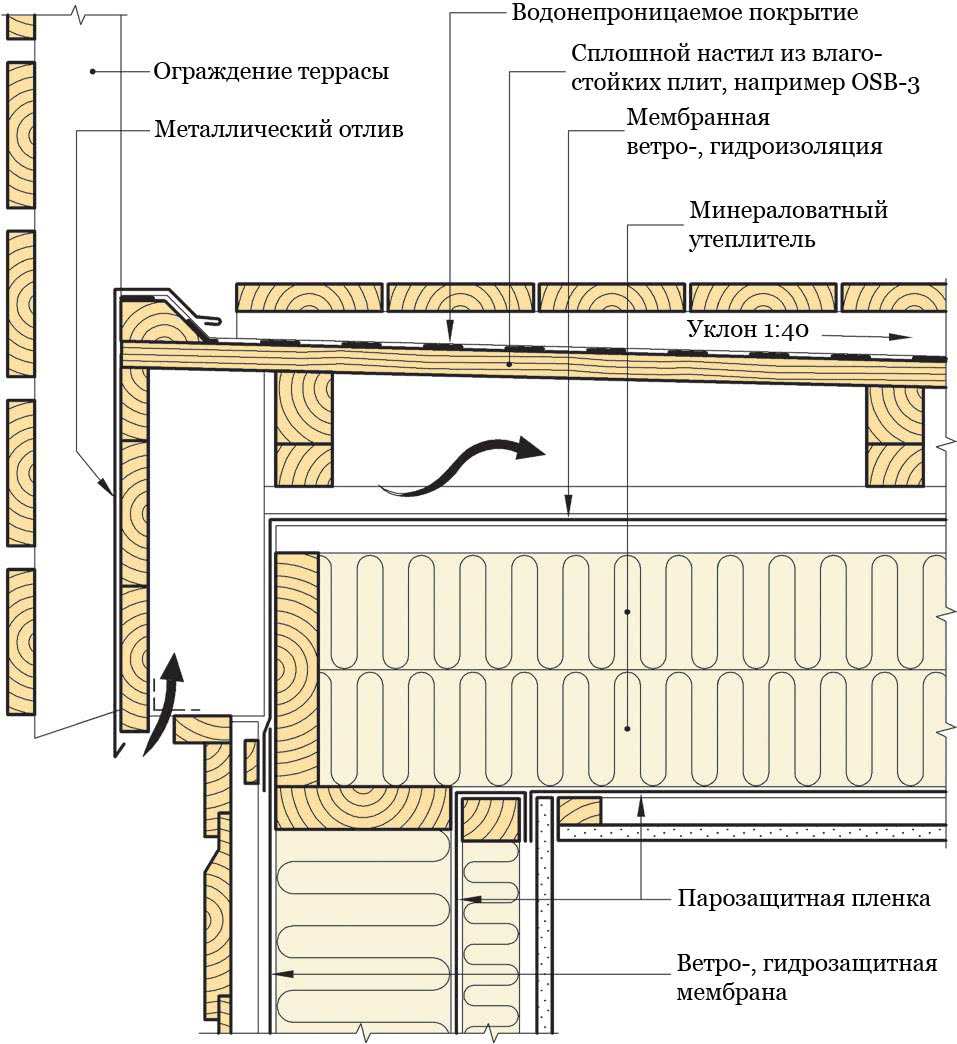 Рис. 813b. Устройство изолированной вентилируемой террасы с внутренней системой водоотвода. Открытая сторона оснащена бортиком. Разрез произведен вдоль балок террасы.