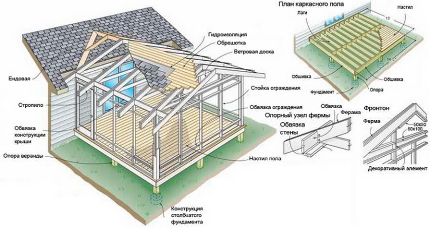 осуществляется в последнюю очередь, хотя именно с его закладки начинается строительство веранды. Причина подобного подхода заключается в необходимости знать полный вес пристройки, учитывая также снежную, ветровую и эксплуатационную нагрузку на неё. Тем не менее, часто под веранды устанавливаются столбчатые, свайные или ленточные фундаменты: